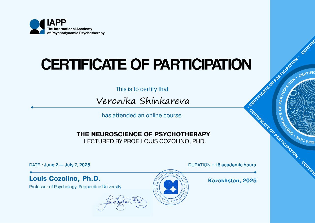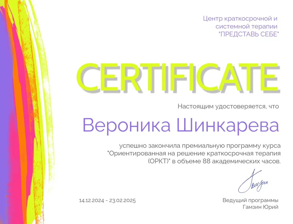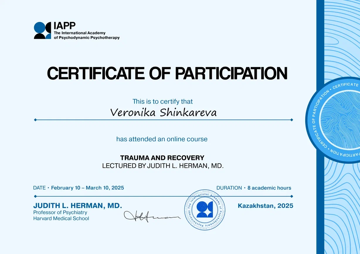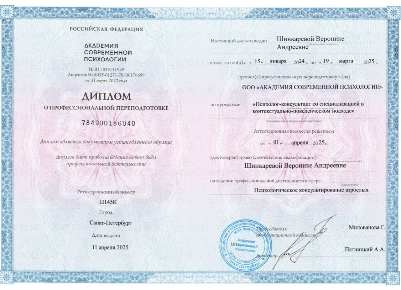 На данный момент придерживаюсь подходов ACT (терапия принятия и ответственности), КПТ (когнитивно-поведенческая терапия), ОРКТ (ориентированная на решение краткосрочная терапия). Веду практику с октября 2024 г.