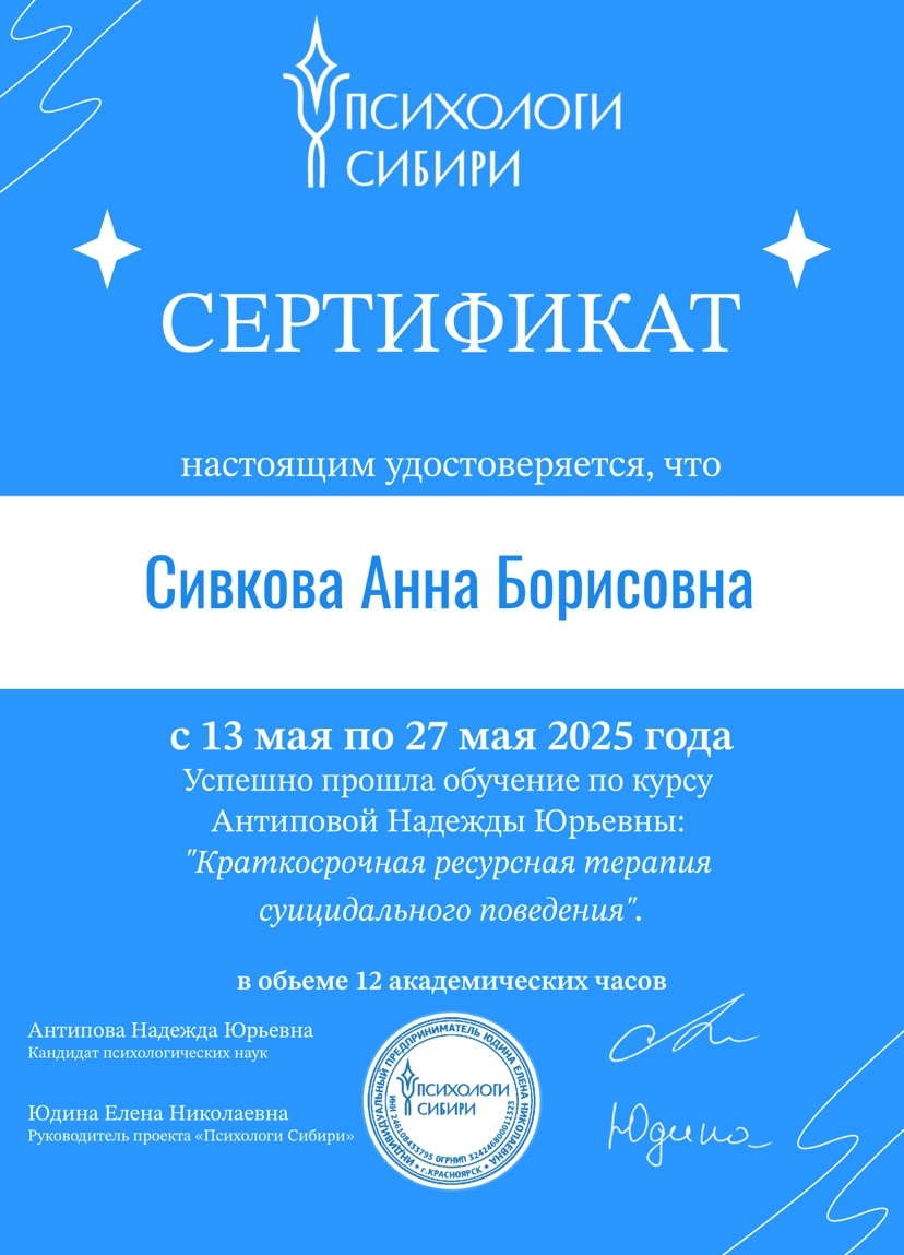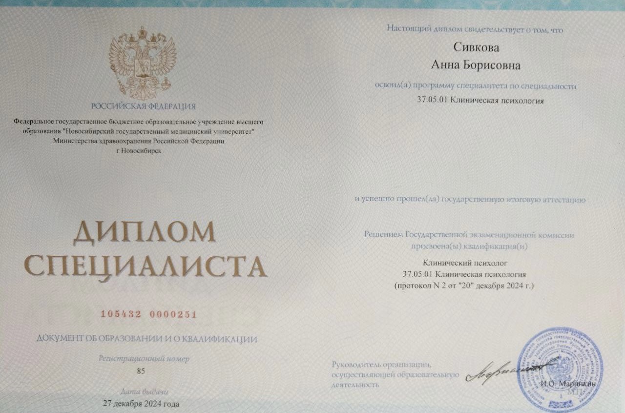 Меня зовут Анна, и я профессиональный психолог. У меня небольшой, но очень насыщенный и разнообразный опыт: я работала как в клинических и исправительных учреждениях, так и в подростковом центре. Я убеждена, что главное – не количество отработанных лет, а качество и результат моей работы. Уже больше полугода я официально работаю подростковым психологом (при поддержке фонда "Солнечный город"). Я окончила Новосибирский медицинский университет по специальности «Клиническая психология» и постоянно повышаю свою квалификацию в различных направлениях: