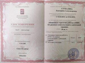 Высшее психологическое образование, по первому образованию биолог. Прошла обучение по программам повышение квалификации в подходе ОРКТ (ориентированное на решение краткосрочная терапия), продолжаю обучение в подходе логотерапия и экзистенциальный анализ. Состою в Ассоциации оринтированных на решение психотерапевтов и практиков. В работе предпочитаю применять методы краткосрочной терапии – когда необходимо срочно снять негативные переживания. В длительную глубинную работу с проблемой уходим по запросу клиента.