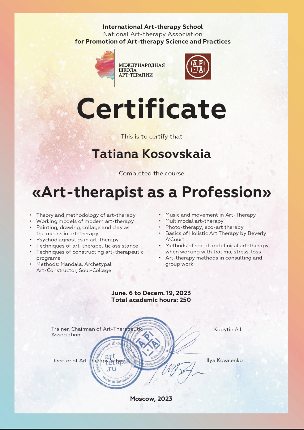 Мой подход - интегративный, я совмещаю в своей практике различные методы в зависимости от того,что больше подходит моим клиентам (бодинамику, психодраму, арт-терапию, кст, процессуальный и телесно-ориентированные методы и др).
