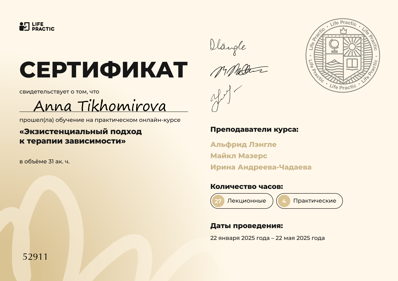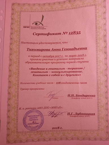 В своей работе я опираюсь на гештальт-подход, который позволяет рассматривать человека в контексте его жизни, опыта и окружения. Я верю, что именно во взаимосвязи этих факторов рождаются смыслы, определяющие нашу жизнь. Сейчас я углубляю свои знания в области травмы, теорий привязанности и семейных отношений, чтобы оказывать помощь еще более комплексно.