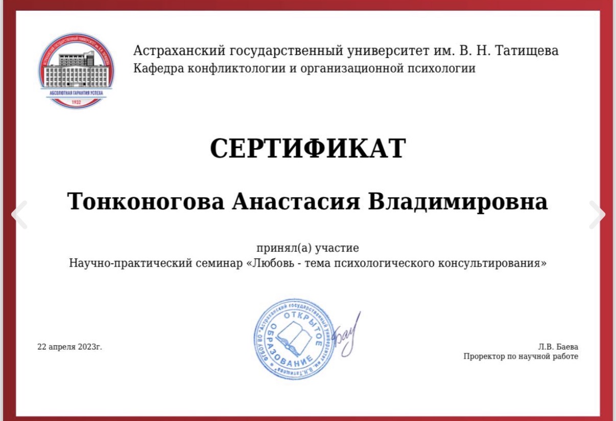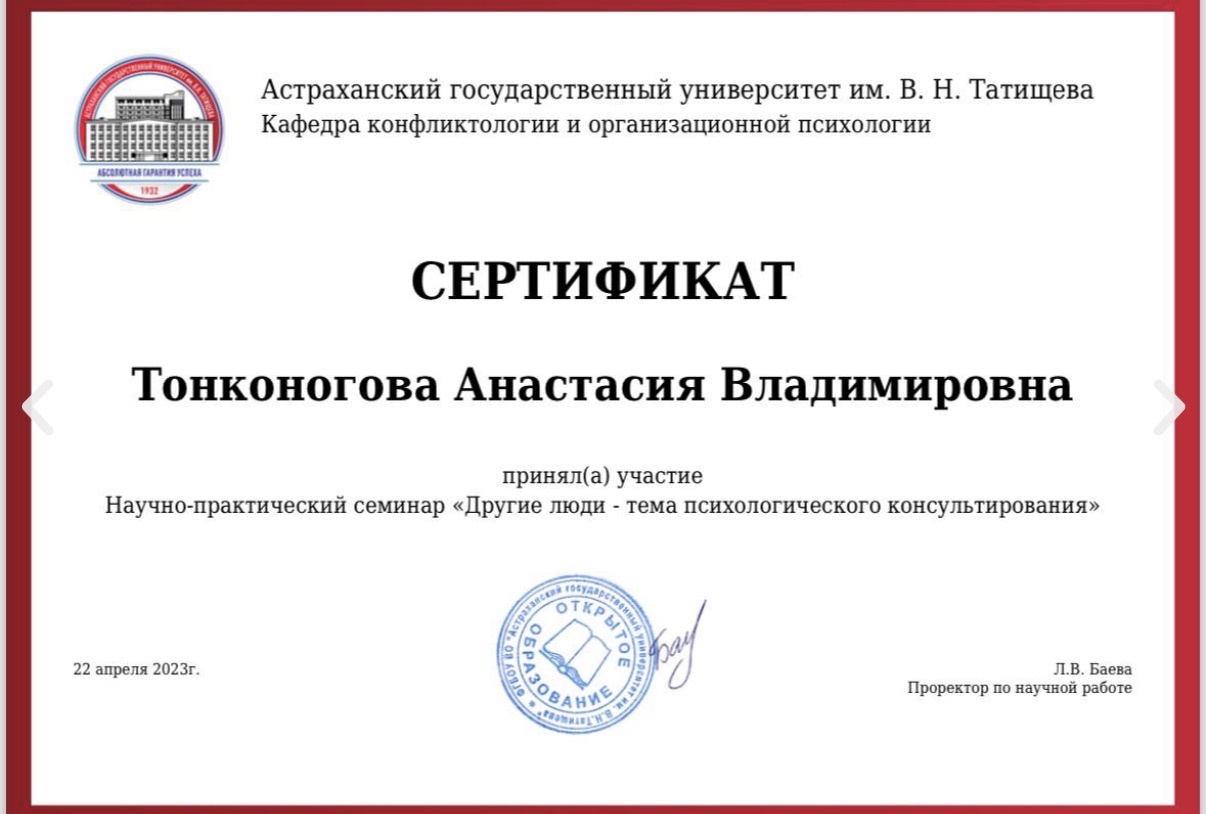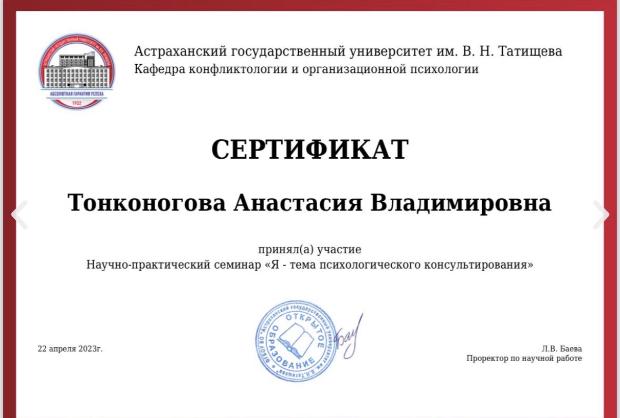 Меня зовут Анастасия Тонконогова, и я – практикующий психолог в Астрахани, который страстно увлечён своей профессией. Постоянно прохожу курсы повышения квалификации, тестирую новые инструменты, оставляя и применяя в работе только самые лучшие и эффективные техники.