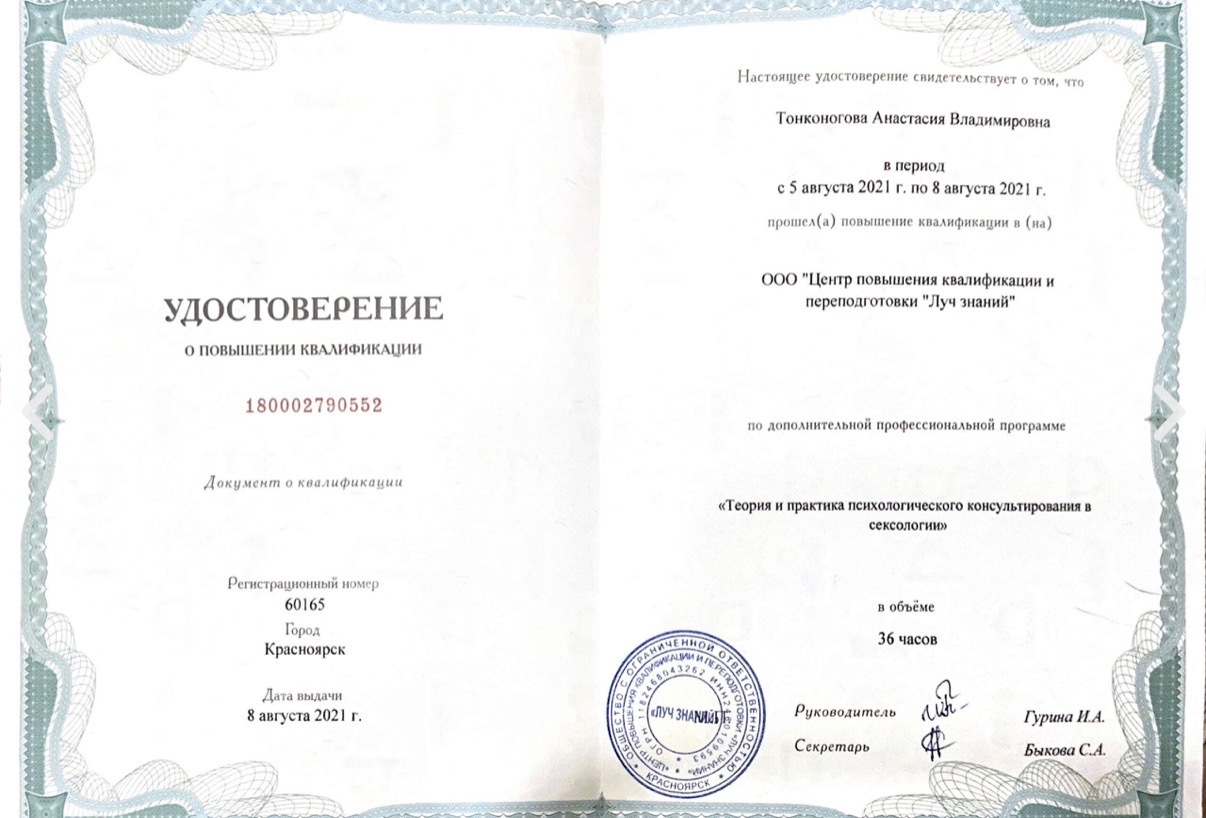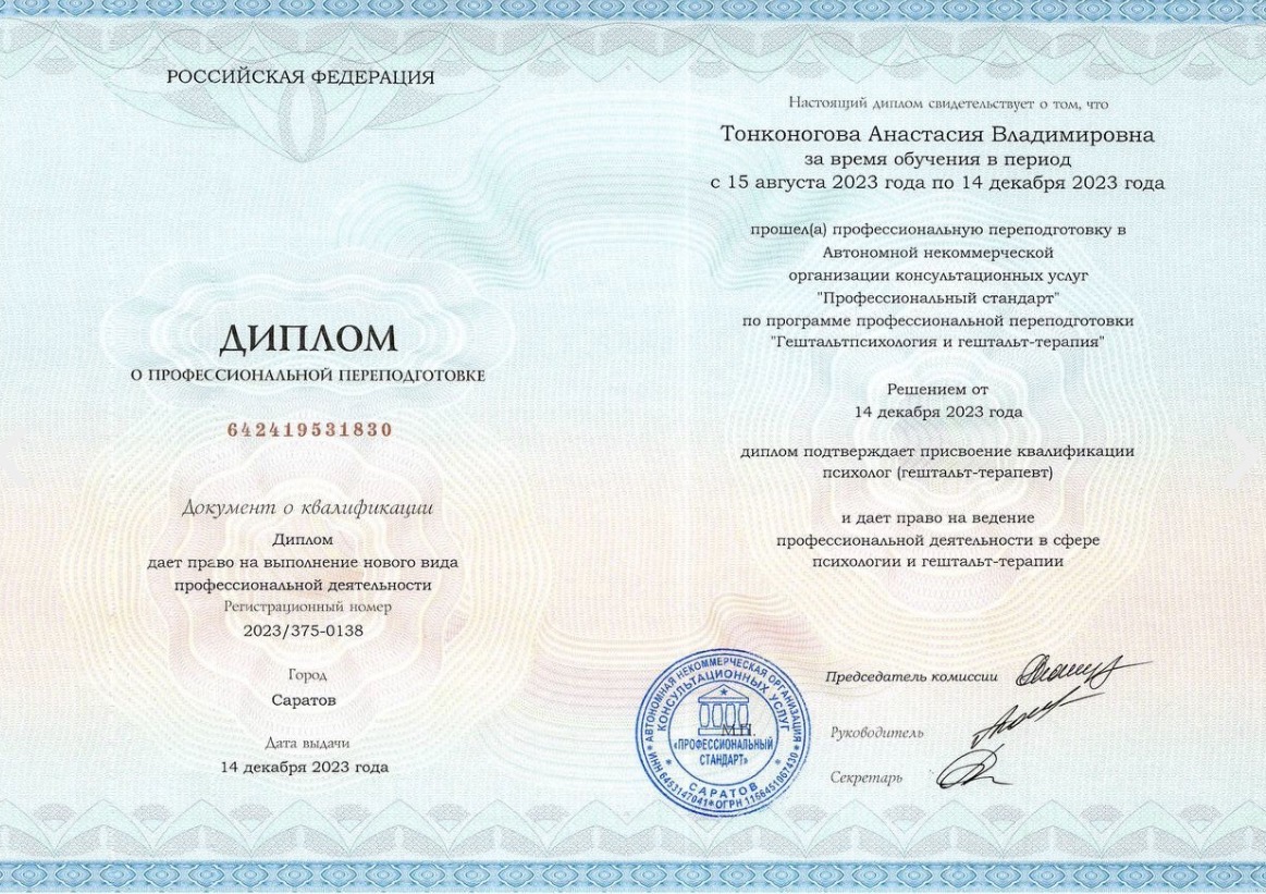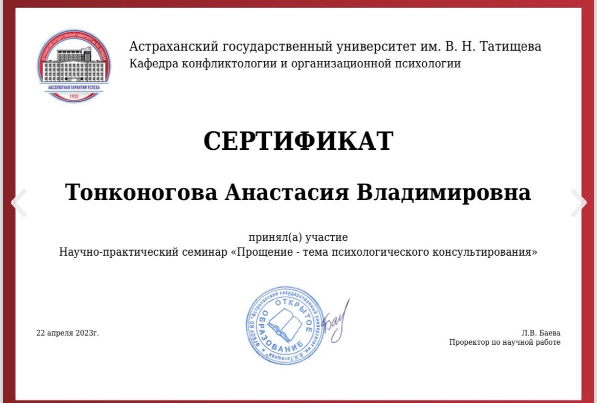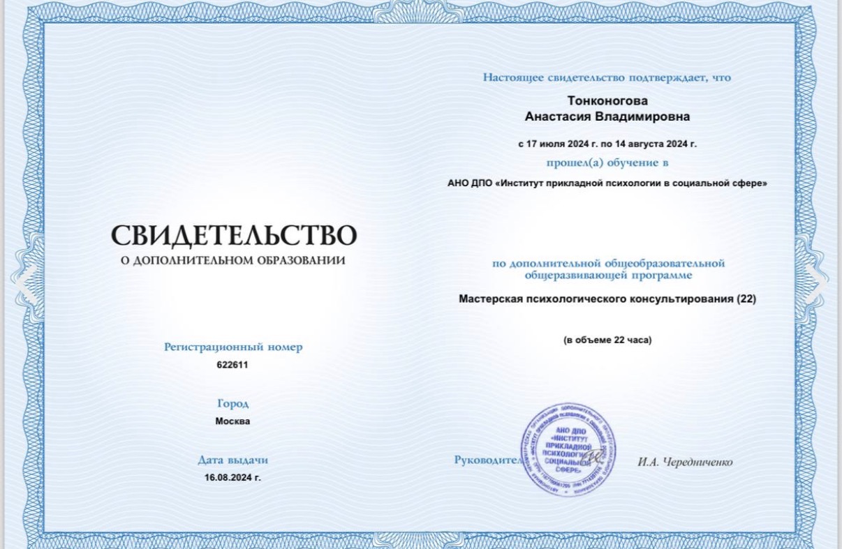 Меня зовут Анастасия Тонконогова, и я – практикующий психолог в Астрахани, который страстно увлечён своей профессией. Постоянно прохожу курсы повышения квалификации, тестирую новые инструменты, оставляя и применяя в работе только самые лучшие и эффективные техники.