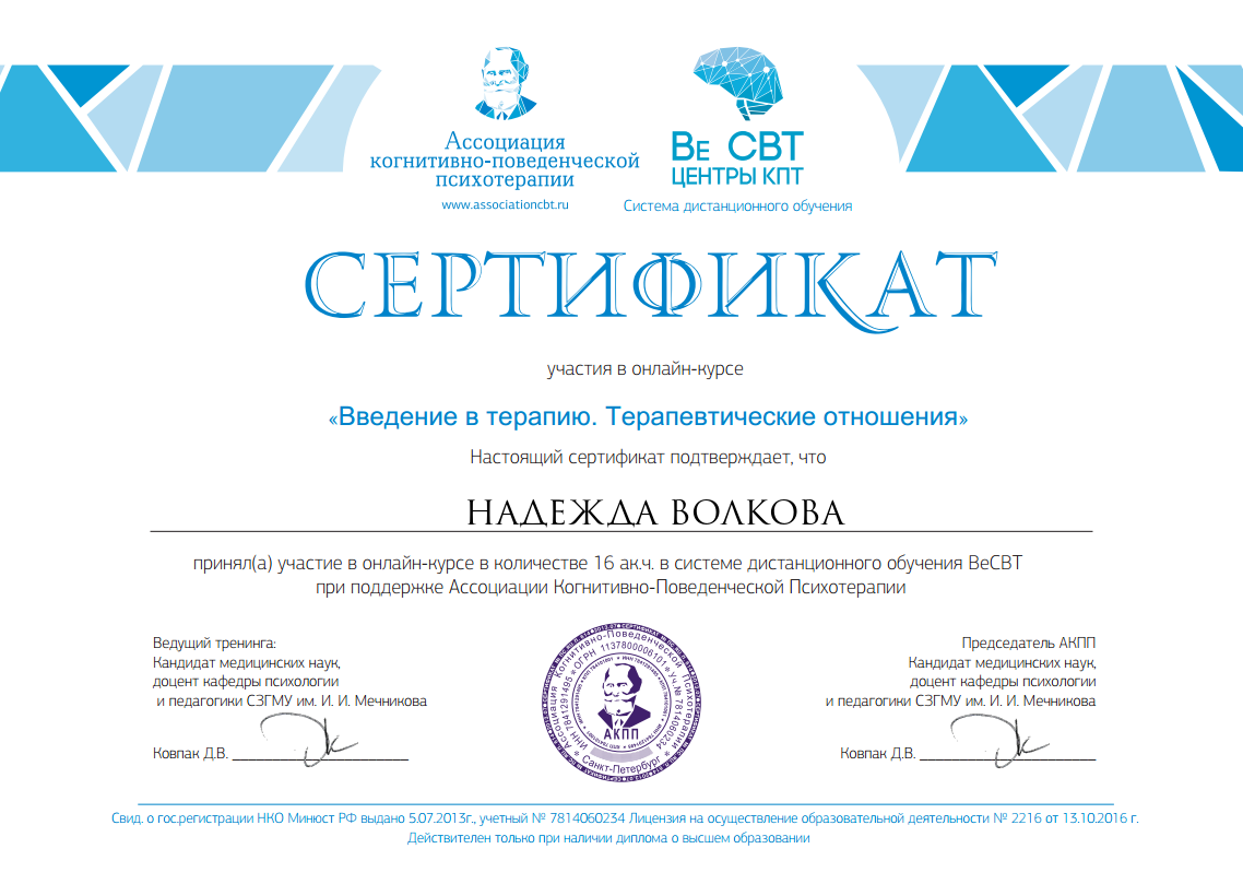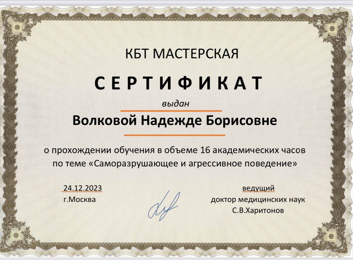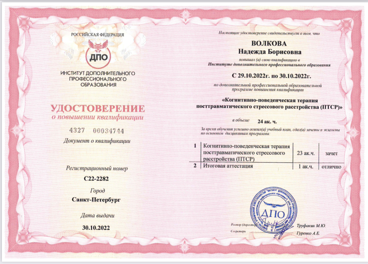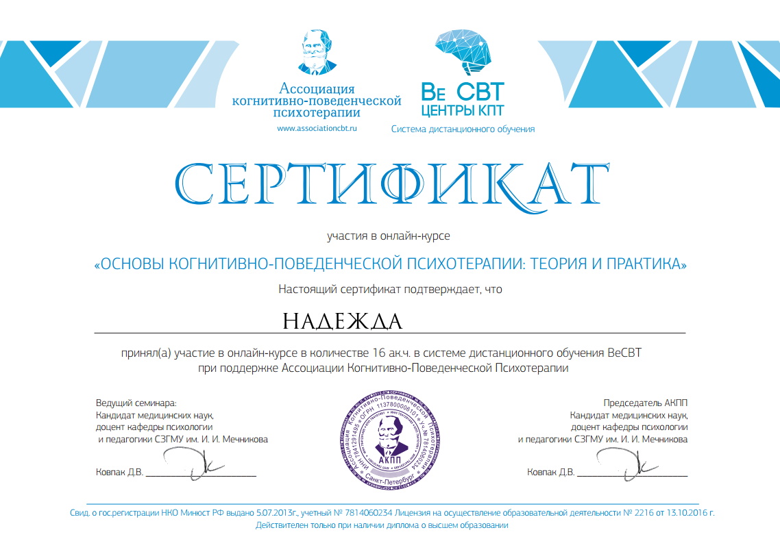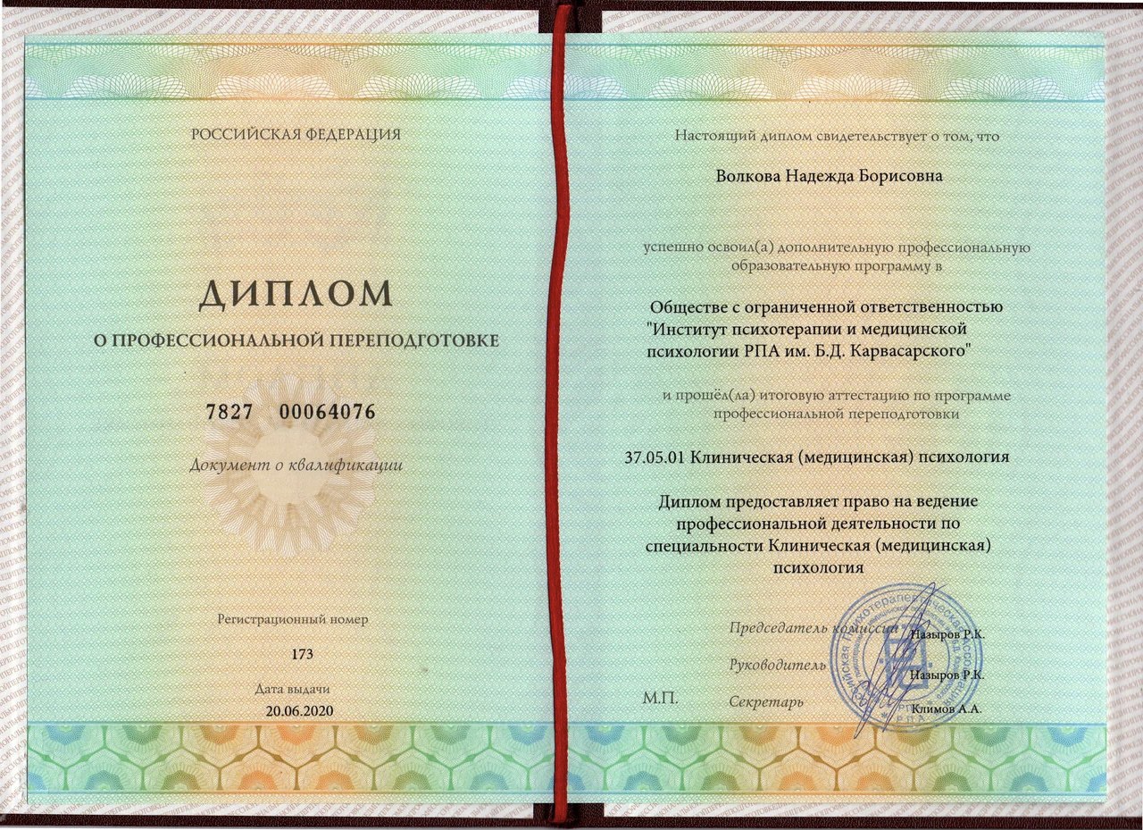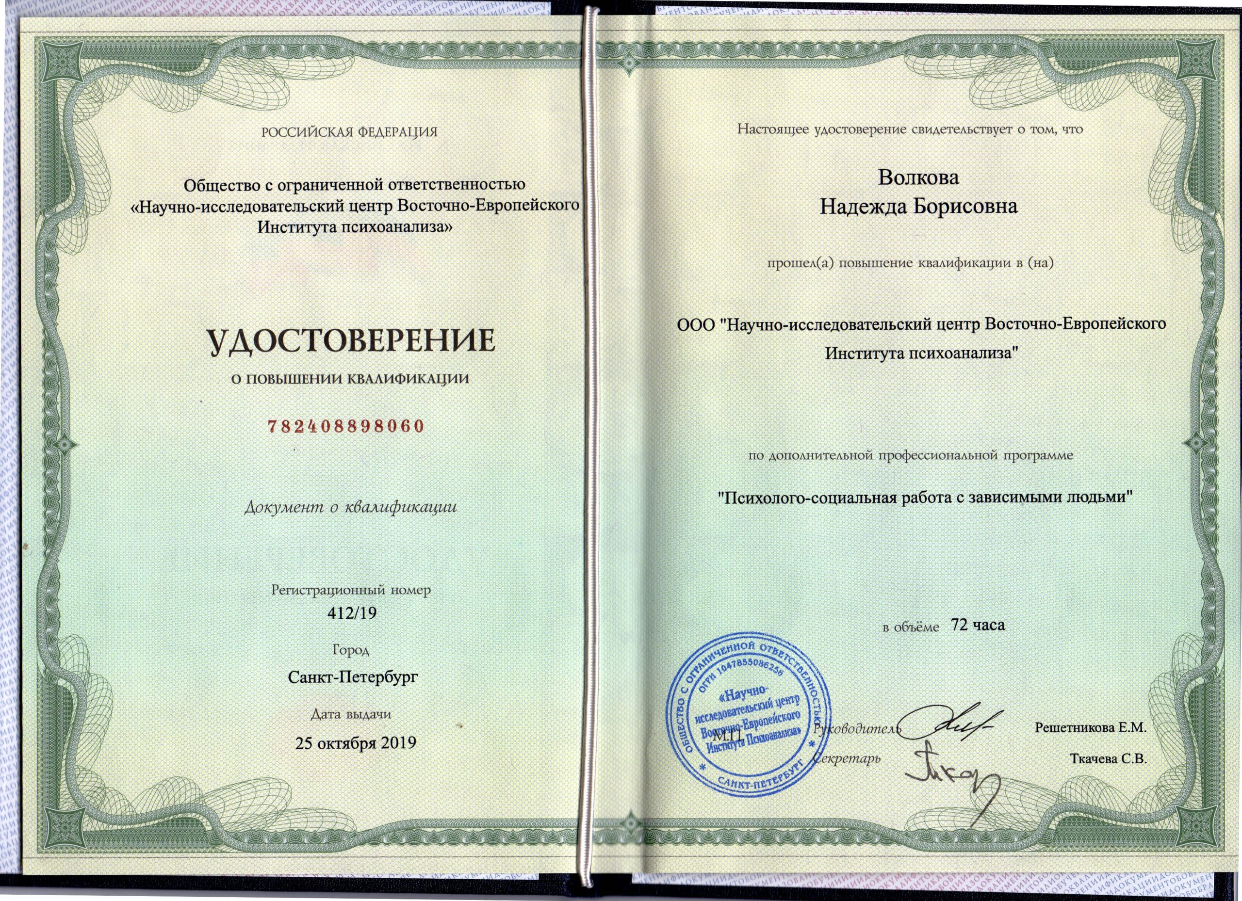 Психологи-социальная работа с зависимыми людьми Выдан: ООО «научно исследовательский центр Восточно Европейского Института психоанализа Продолжительность: 72 часов