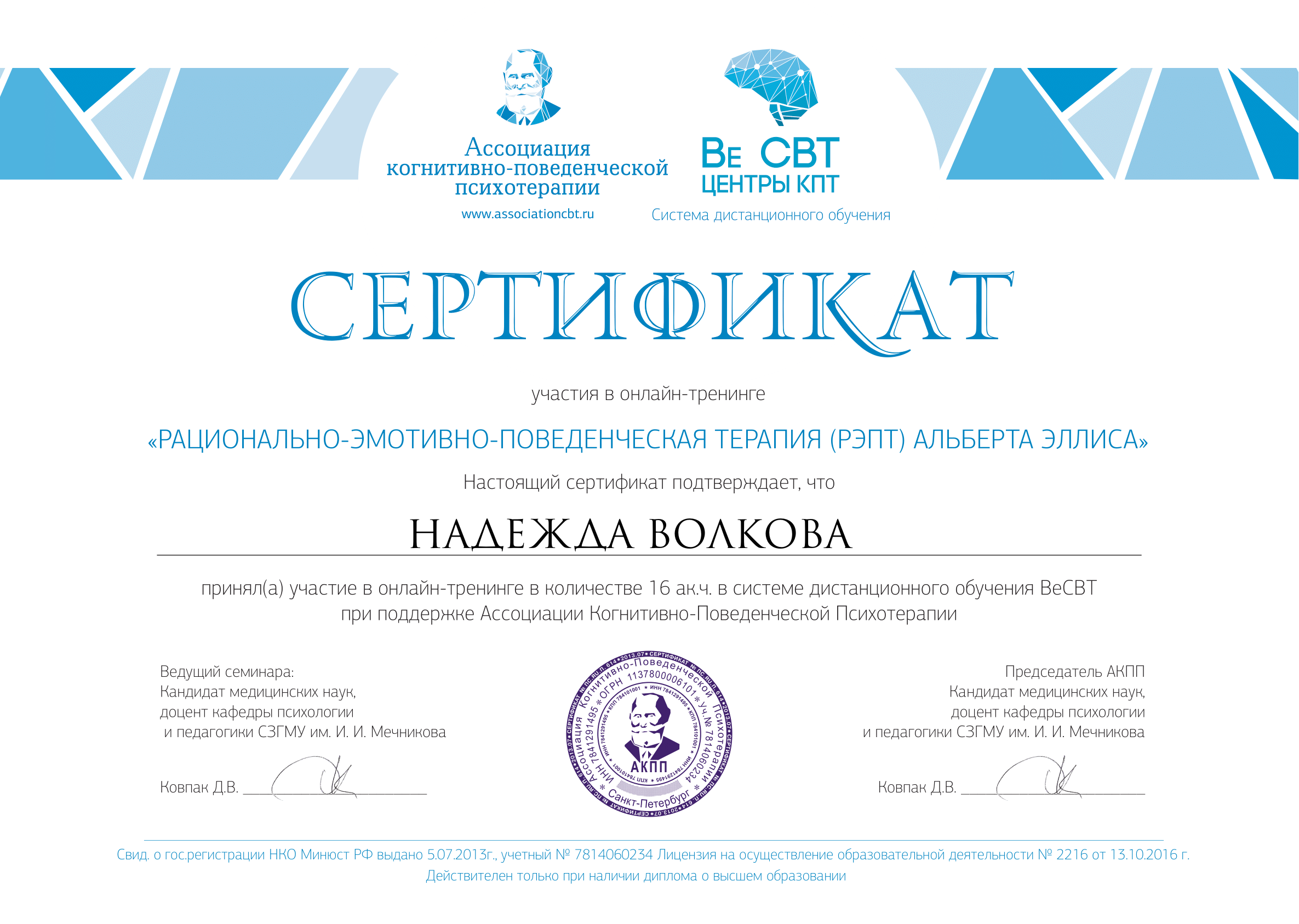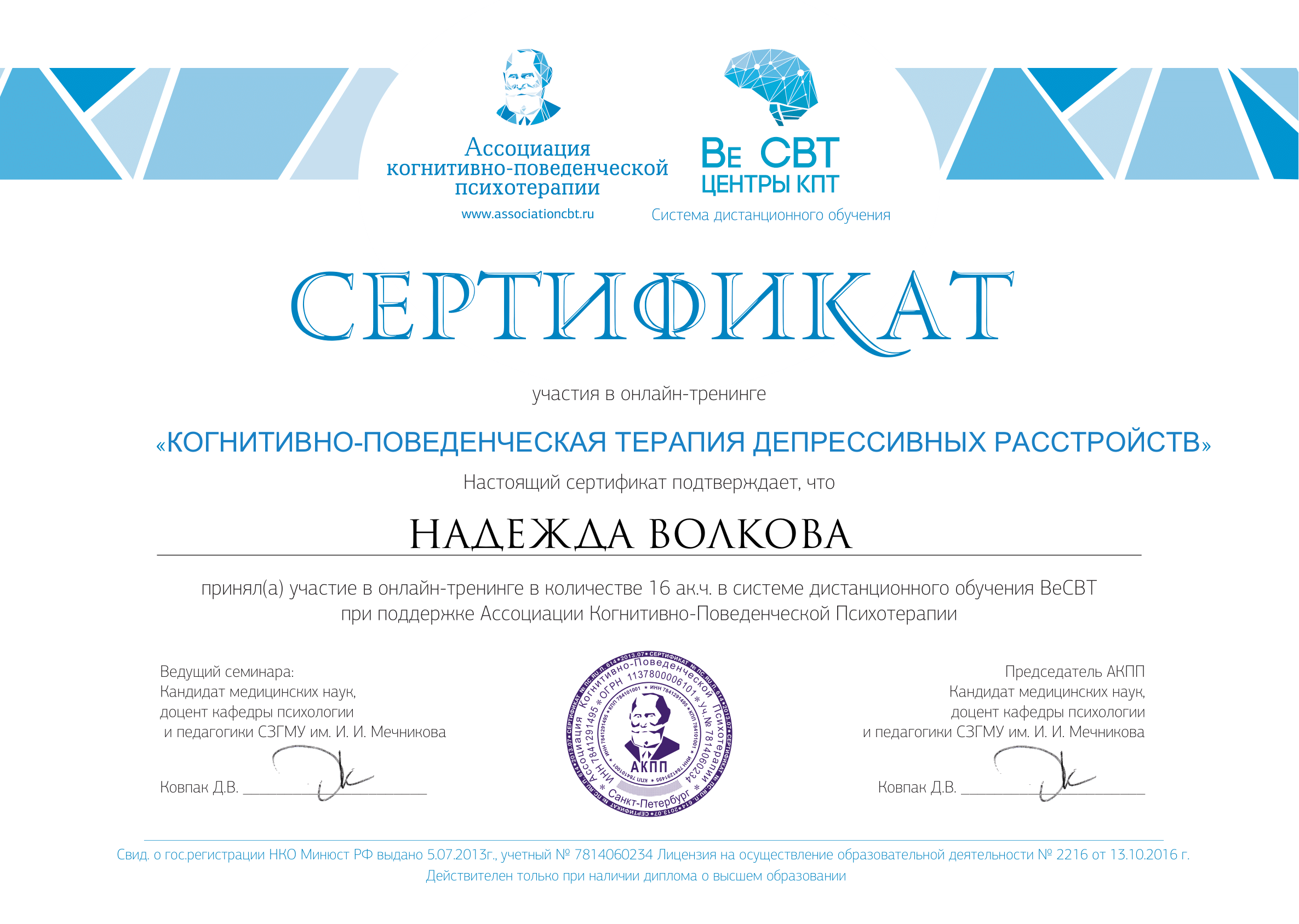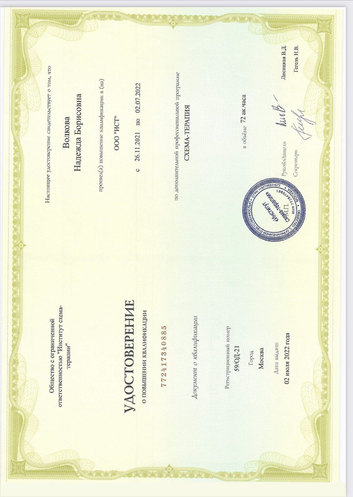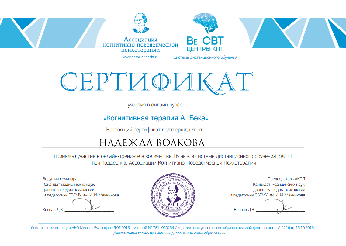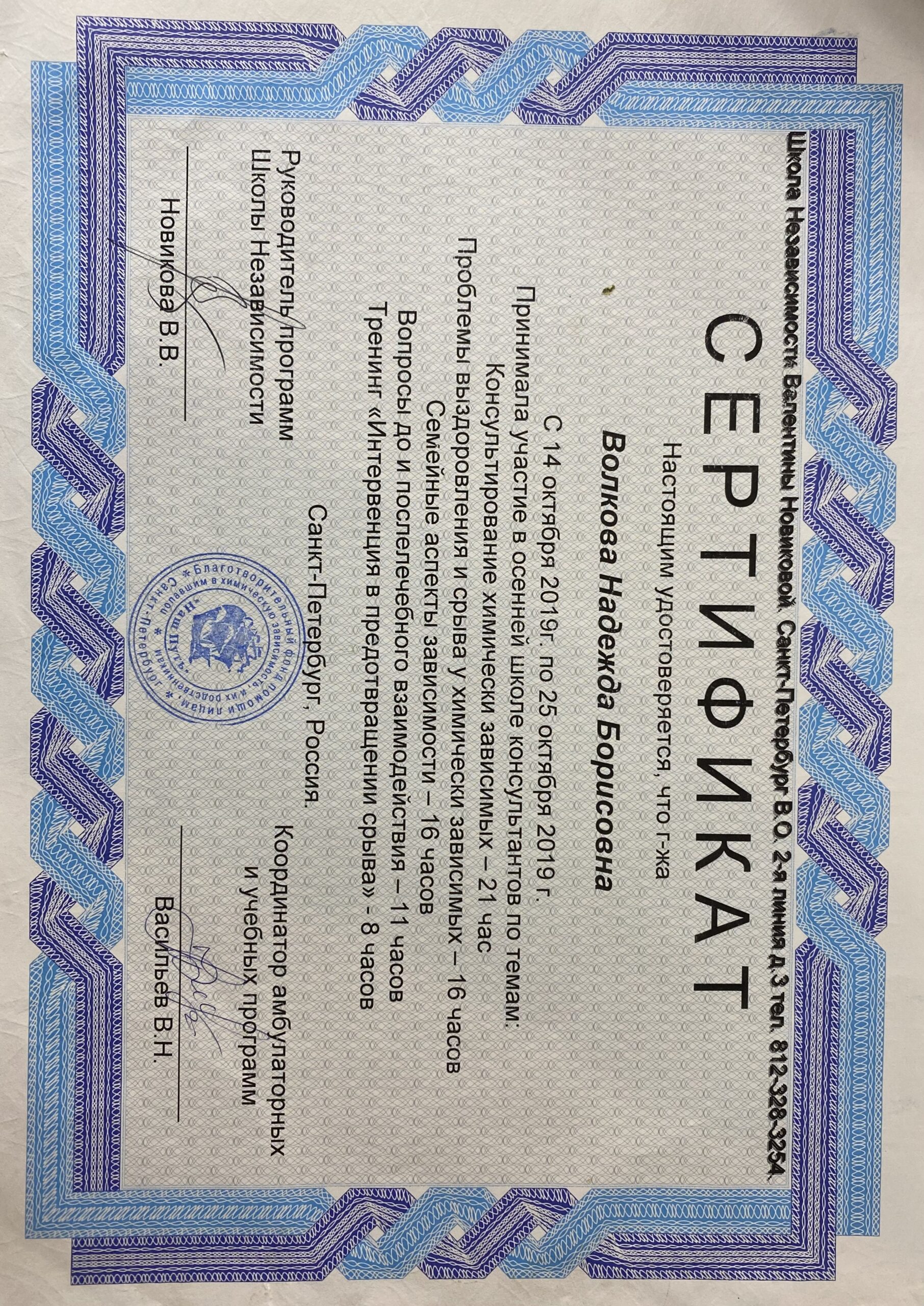 Психологи-социальная работа с зависимыми людьми Выдан: ООО «научно исследовательский центр Восточно Европейского Института психоанализа Продолжительность: 72 часов