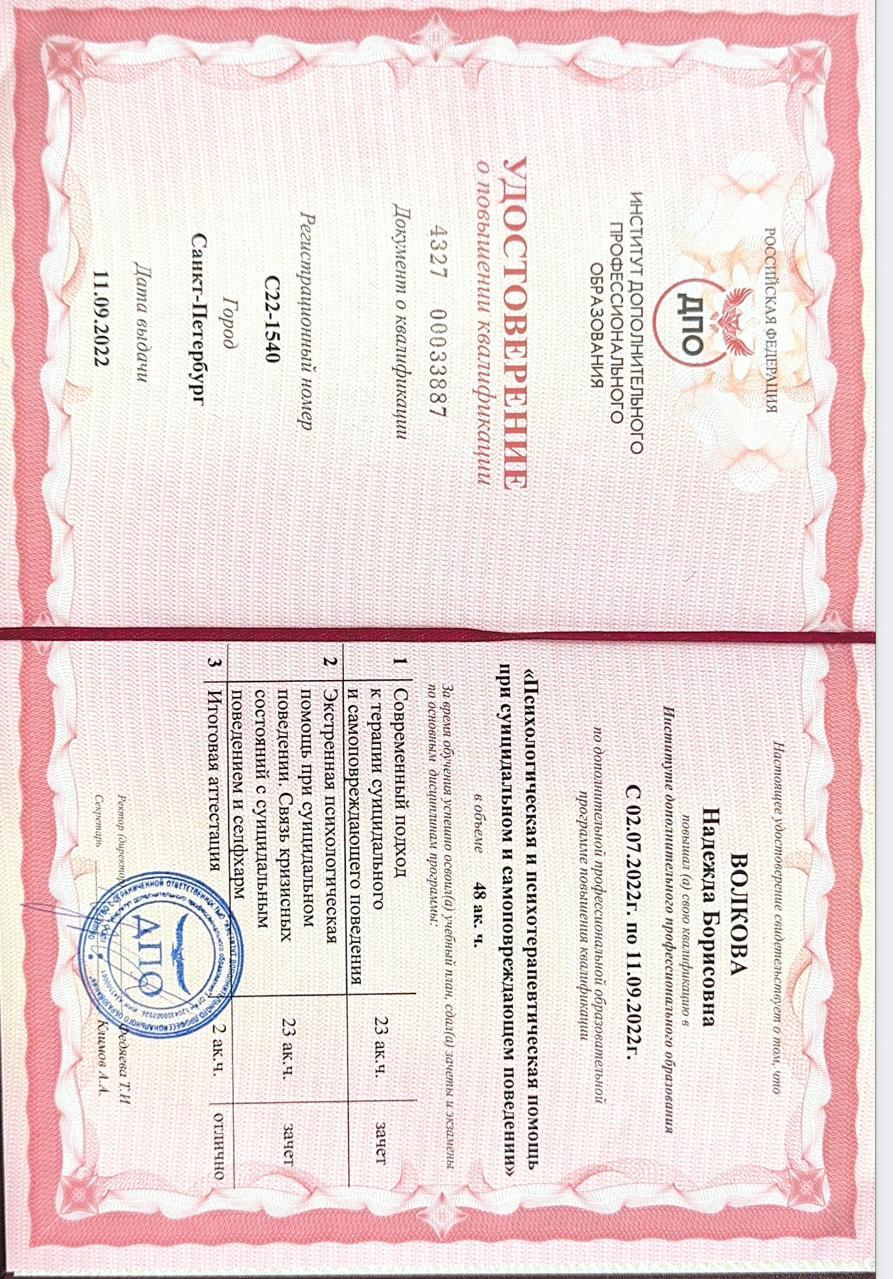 «Психологическая и психотерапевтическая помощь •при суицидальном и самоповреждающем поведении» Выдан: ДПО