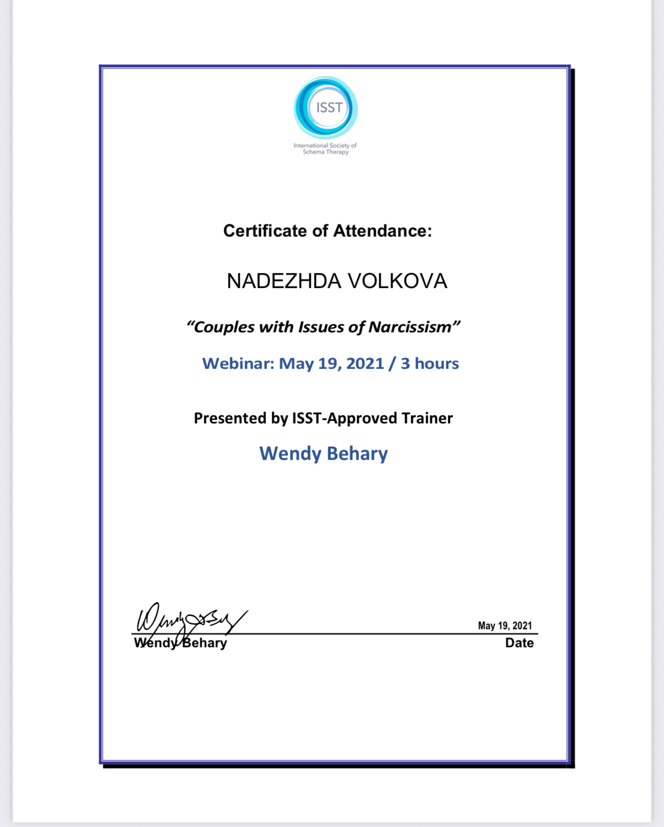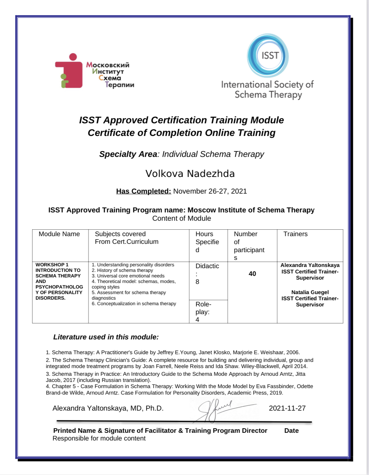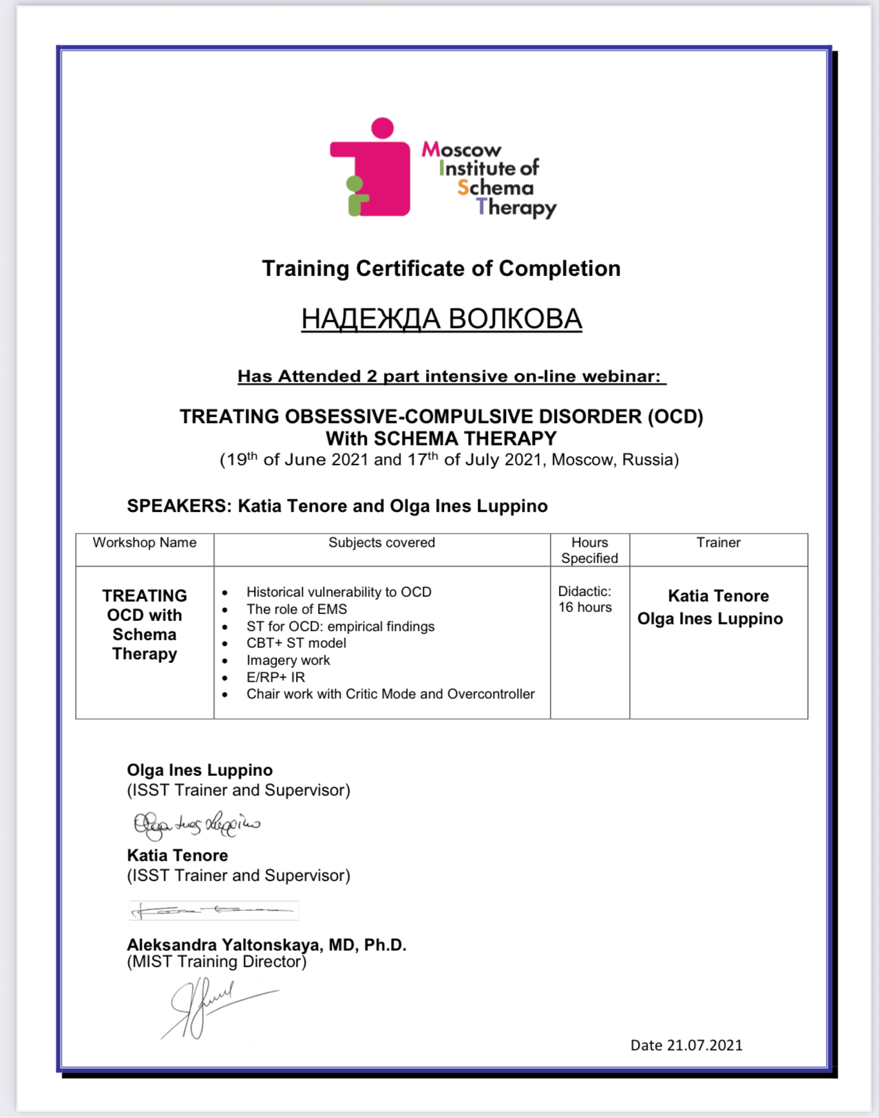 Обучалась у лучших экспертов в области когнитивно-поведенческой терапии (КПТ) третьей волны, включая прохождение обучения (DBT) Диалектико- поведенческой терапии под руководством профессора Андре Иваноффа, официального супервизора