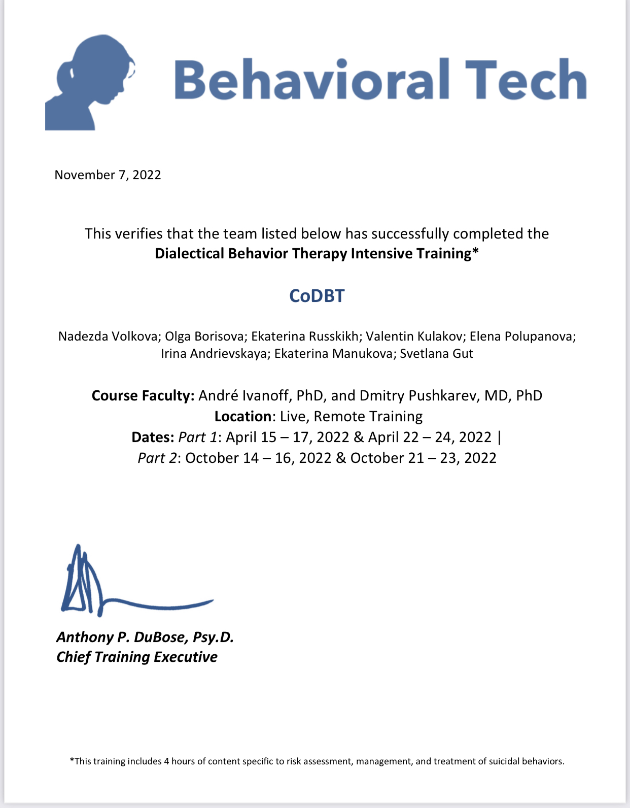 Dialectical Behavior Therapy Intensive Training* Выдан: Behavioral Tech Продолжительность: 240 часов