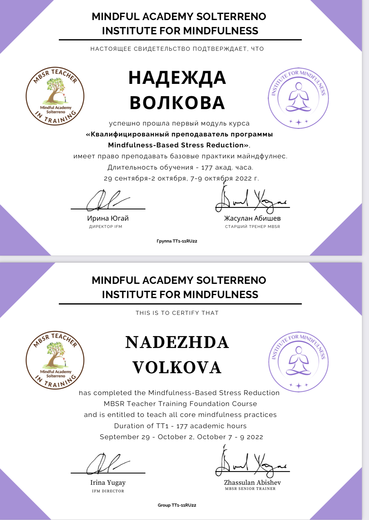 Член ассоциации Когнитивно поведенческой психотерапии. Тренер Mindfulness MBSR MBCT