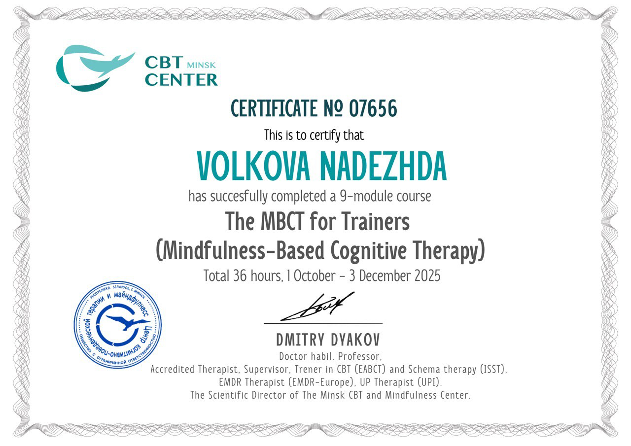 Член ассоциации Когнитивно поведенческой психотерапии. Тренер Mindfulness MBSR MBCT