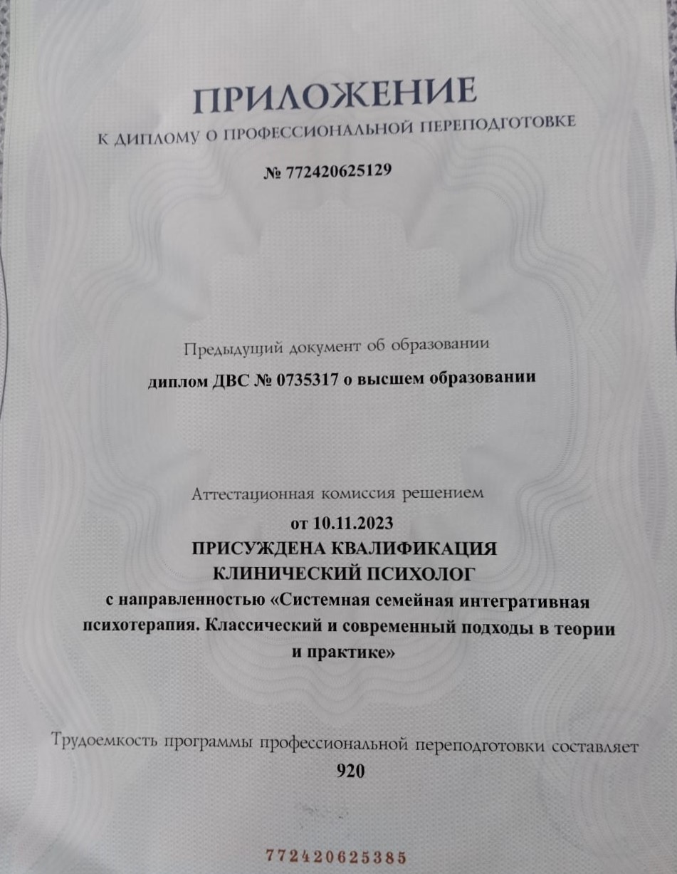 Системная семейная терапия стала моей базой для понимания человека. Основное образование по клинической психологии позволяет вовремя заметить симптомы, это помогает предотвратить развитие серьёзных психологических проблем. Повышение квалификации в области когнитивно-поведенческой терапии даёт возможность эффективно работать с тревогами и убеждениями.
