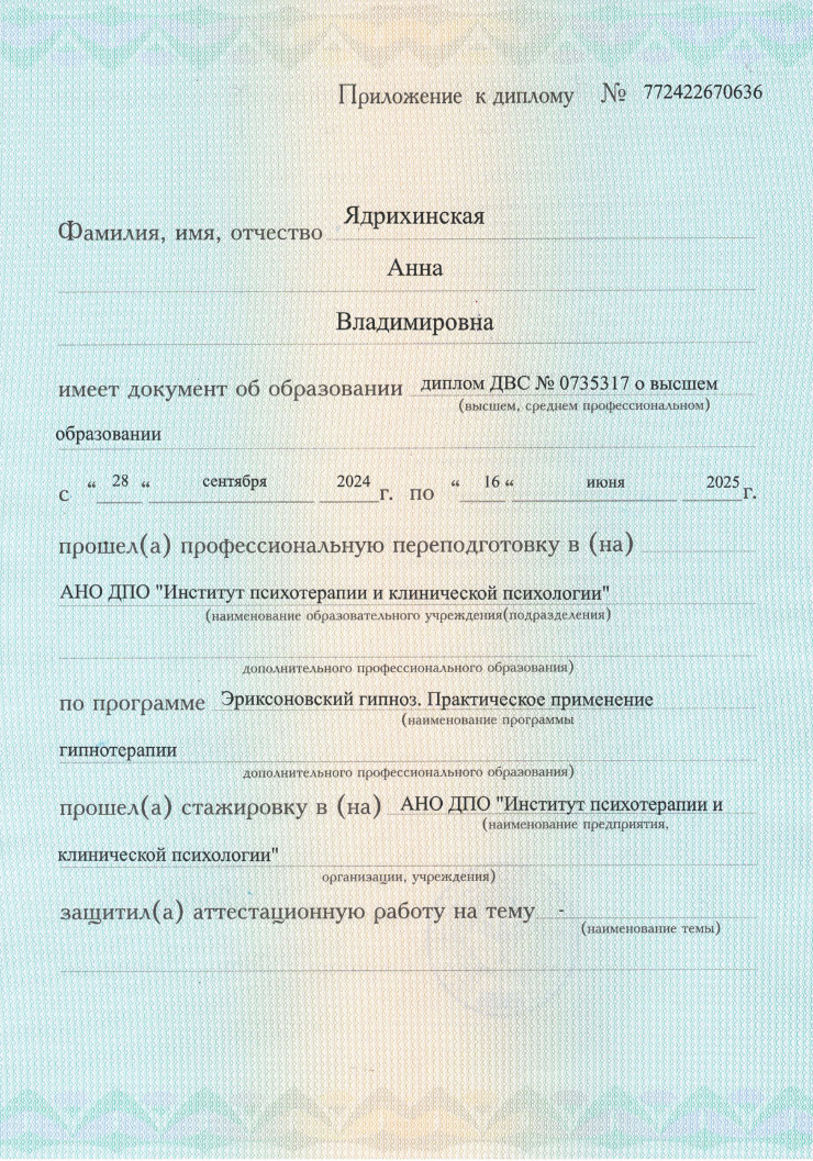 Здравствуйте, меня зовут Анна, я специалист в системной семейной терапии и эриксоновском гипнозе.