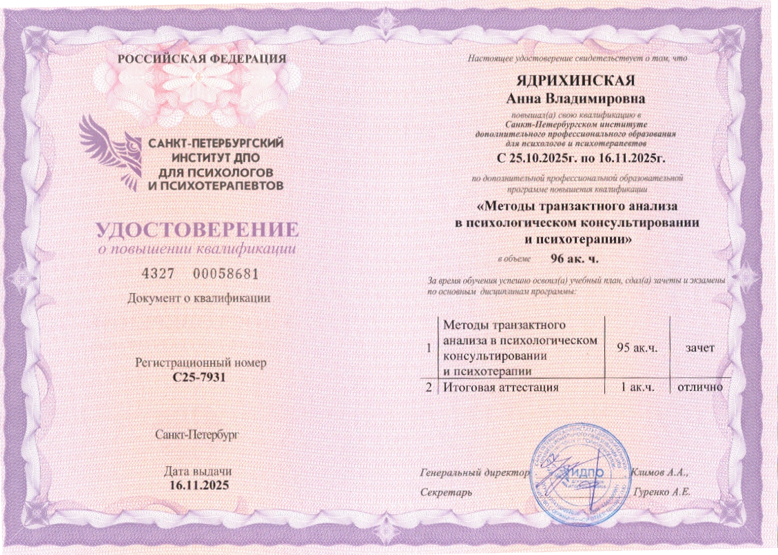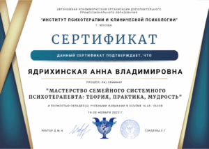Здравствуйте, меня зовут Анна, я специалист в системной семейной терапии и эриксоновском гипнозе.