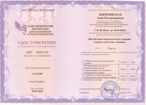 Системная семейная терапия стала моей базой для понимания человека. Основное образование по клинической психологии позволяет вовремя заметить симптомы, это помогает предотвратить развитие серьёзных психологических проблем. Повышение квалификации в области когнитивно-поведенческой терапии даёт возможность эффективно работать с тревогами и убеждениями.