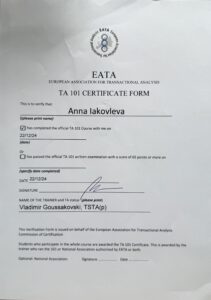Я клинический психолог и нейропсихолог, член Ассоциации EMDR России и Ассоциации Транзактного Анализа СОТА, а также Международной транзактно-аналитической Ассоциации EATA.