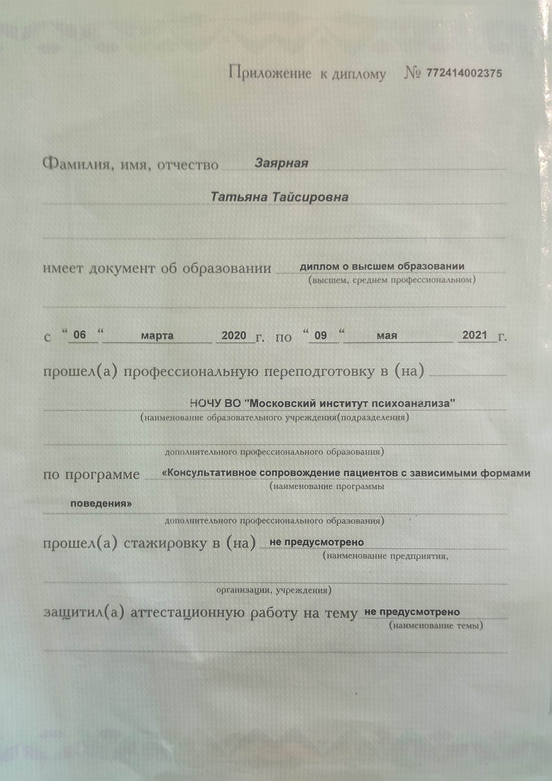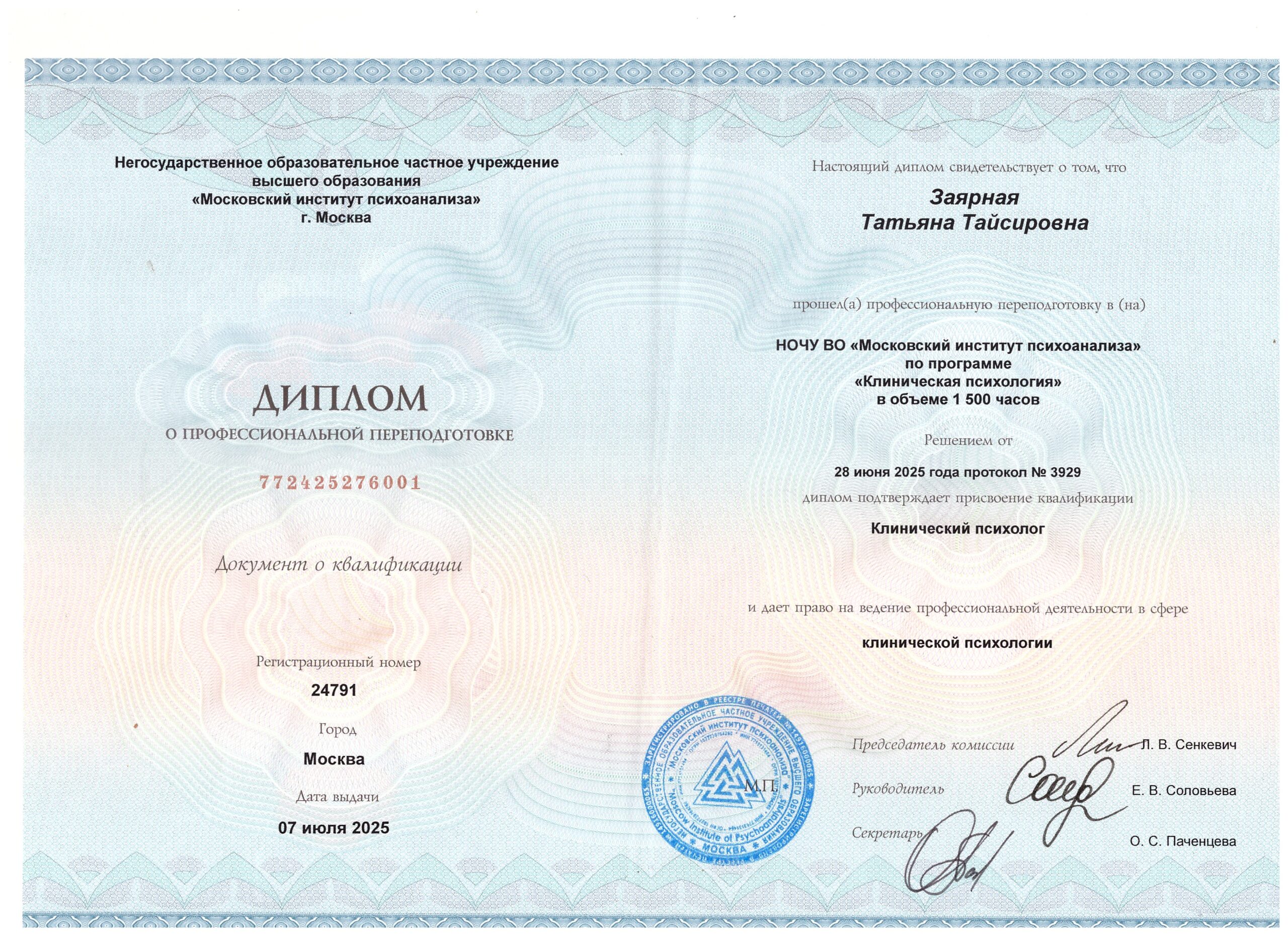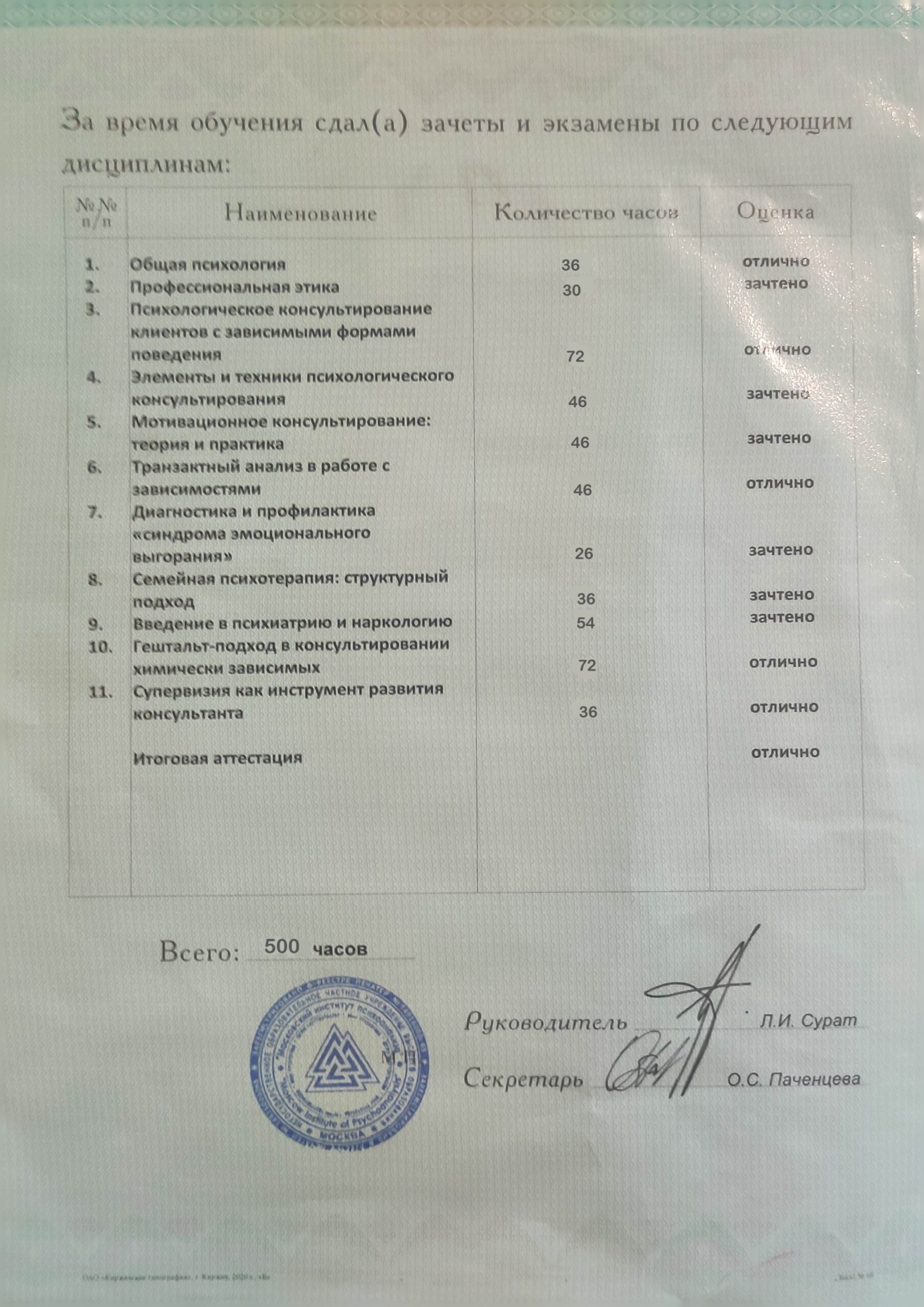 Мой профессиональный путь — это синтез профессионального образования, тысяч часов практики и глубокой специализации в клинической психологии, аддиктологии и консультировании.