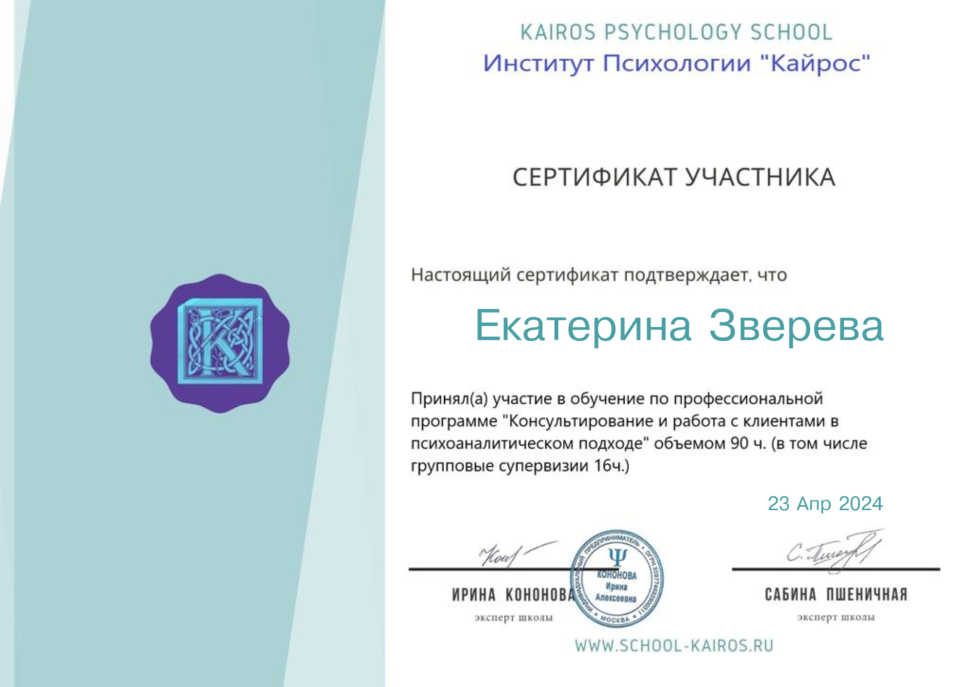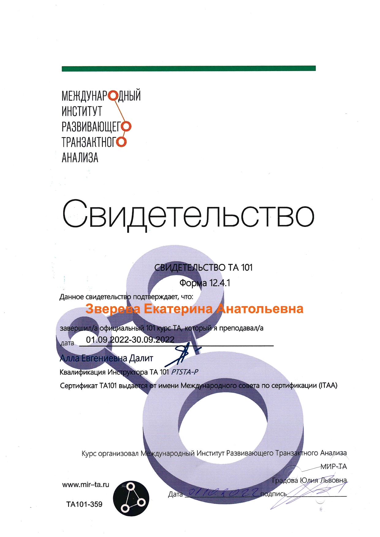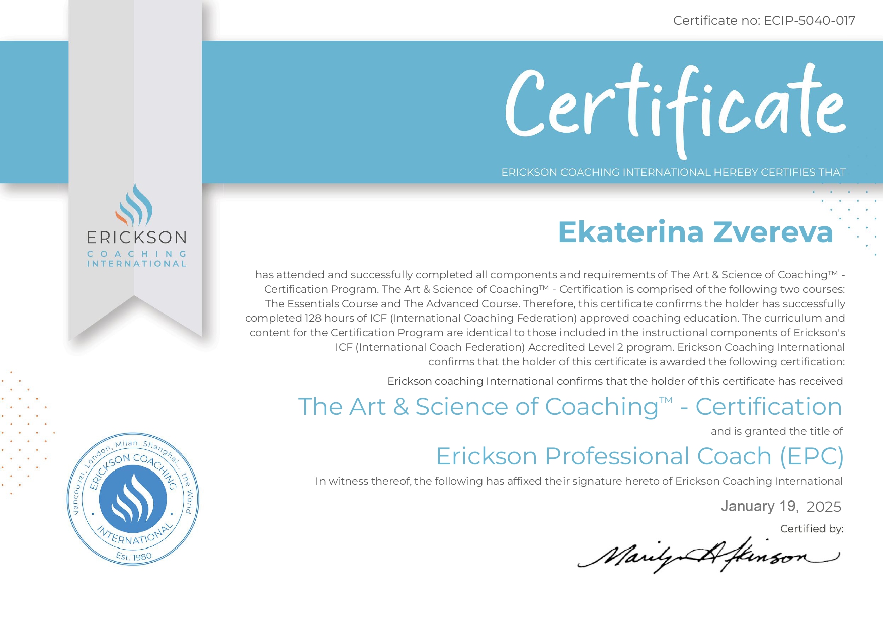 Международный опыт и глубокие знания: ✅ ICF-сертифицированный коуч (International Coaching Federation) с десятками восторженных отзывов ✅ Сертифицированный йога-инструктор (Yoga Alliance International) ✅ MBA (Master of Business Administration) (University of the People, США) ✅ Член Европейской Ассоциации Транзактного Анализа (EATA)