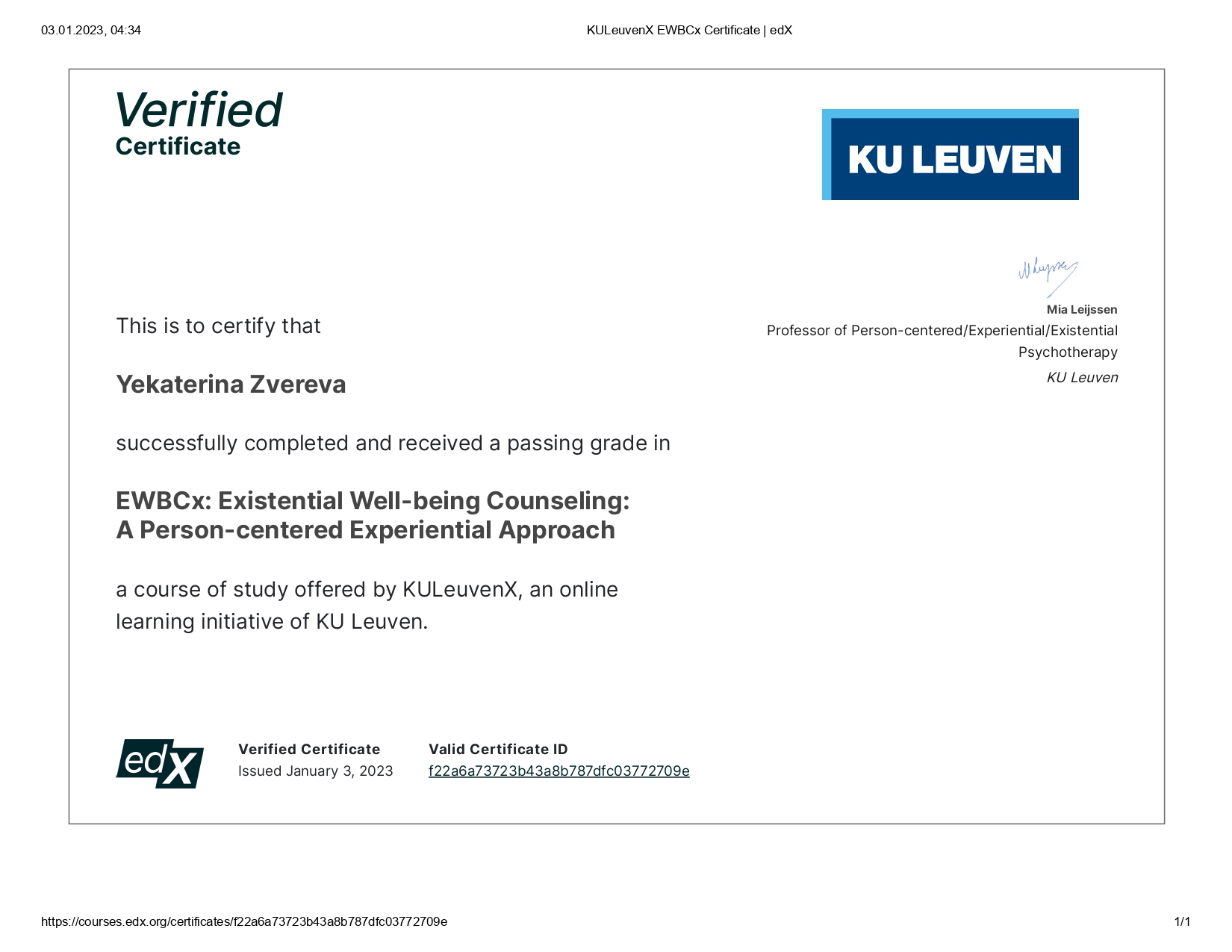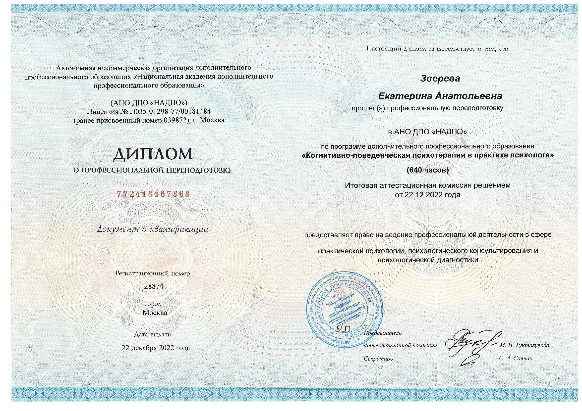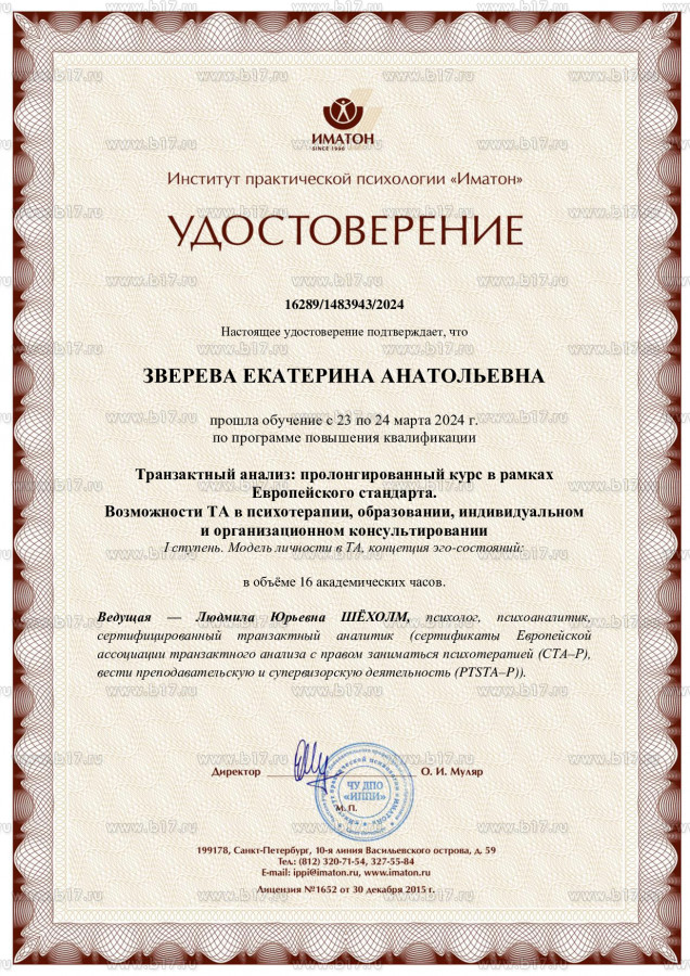 Международный опыт и глубокие знания: ✅ ICF-сертифицированный коуч (International Coaching Federation) с десятками восторженных отзывов ✅ Сертифицированный йога-инструктор (Yoga Alliance International) ✅ MBA (Master of Business Administration) (University of the People, США) ✅ Член Европейской Ассоциации Транзактного Анализа (EATA)